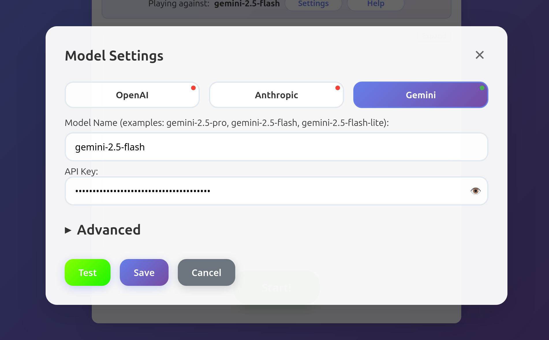 Before you can play you have to connect an LLM. This game supports OpenAI-compatible endpoints, Anthropic and Gemini models. Just click on Settings, select your provider, type in the model name of the LLM you want to play against and add your API key. You can test that your setup works by clicking on the Test button.
