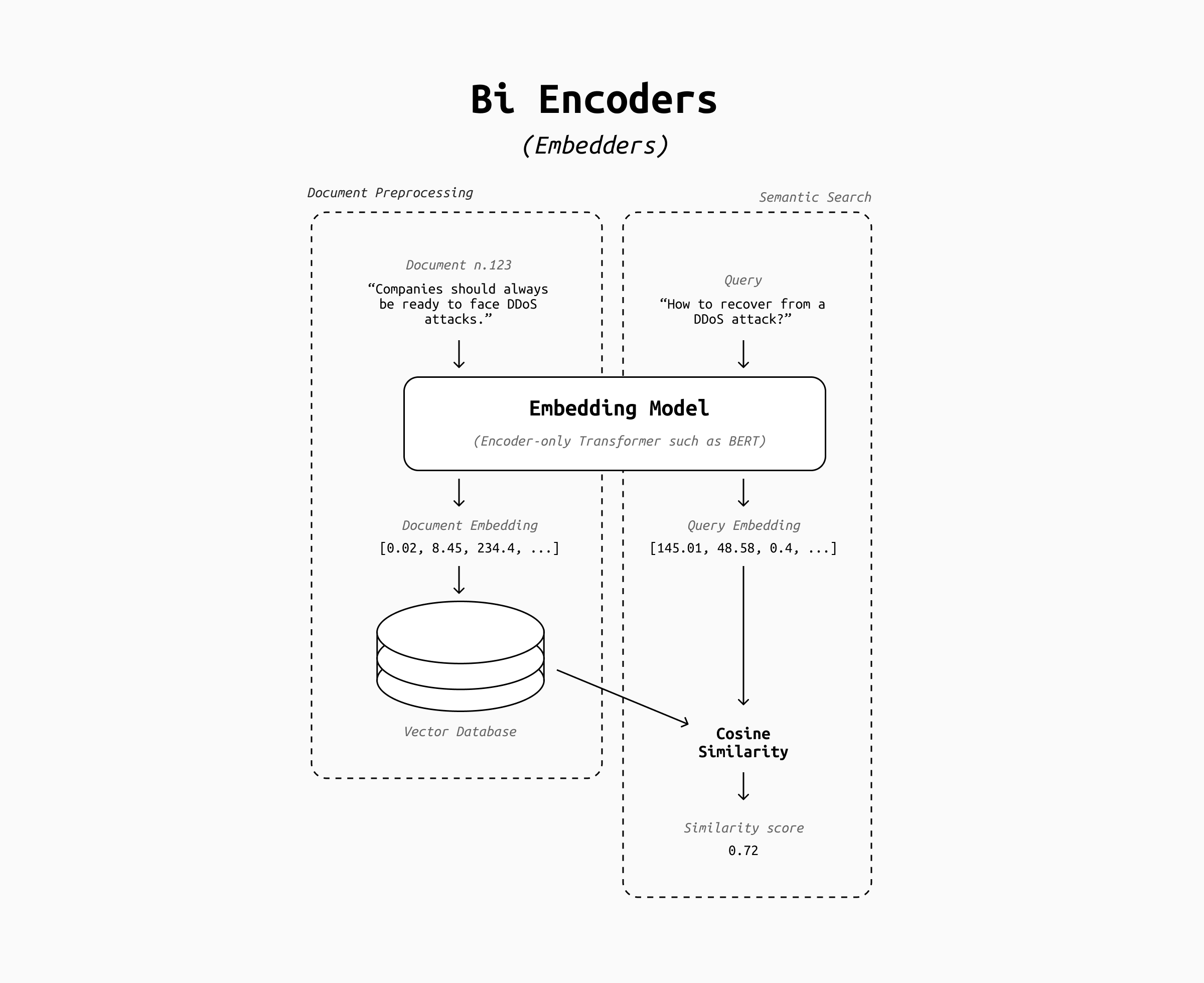 Semantic Search (Bi-Encoder) – Quickly narrows a massive corpus (e.g., millions of document chunks) down to a small candidate set (e.g., top 100 chunks). Bi-encoders can be built with any embedding model: popular closed source embedders include OpenAI's, Voyage.ai, Cohere's, Gemini and more, while on the open-source front you can find BGE embedders, Mistral's models, Jina.ai, Gemma, IBM Granite, and more.