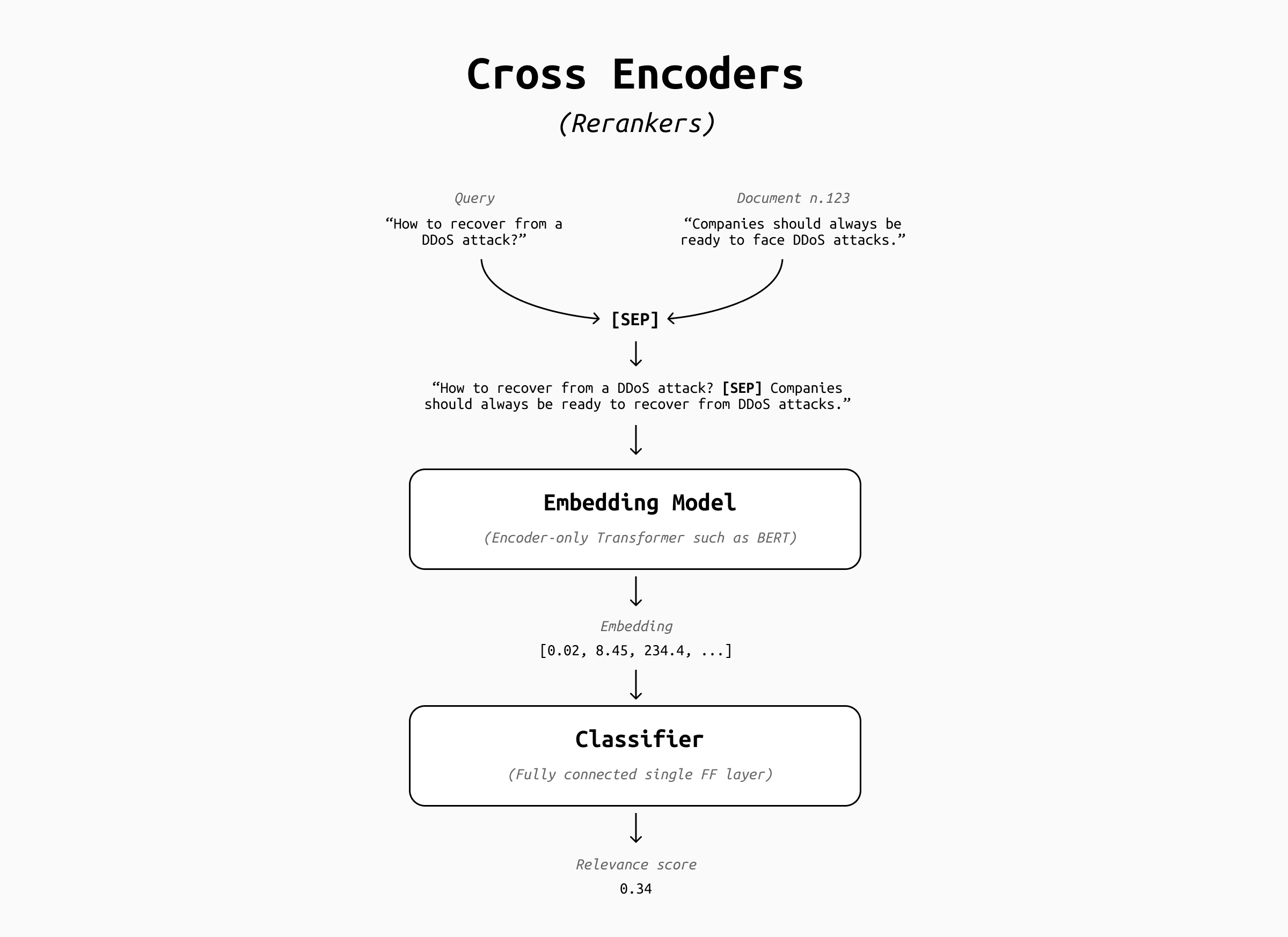 Cross-encoders remedy the limitations of bi-encoders by encoding the query and document together, typically separated by a special token (like [SEP]) using an encoder-only Transformer such as BERT. Then they include an additional fully connected layer that acts as a classifier, learning fine-grained token-level interactions that capture query/document word alignments, answer containment (i.e., does this passage actually answer the question?) and overall contextual relevance.