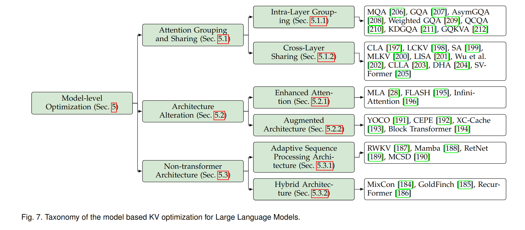 - Augmented Architecture: methods that introduce structural changes for better KV management, for example novel decoder structures (such as YOCO, that included a self-decoder and a cross-decoder step).