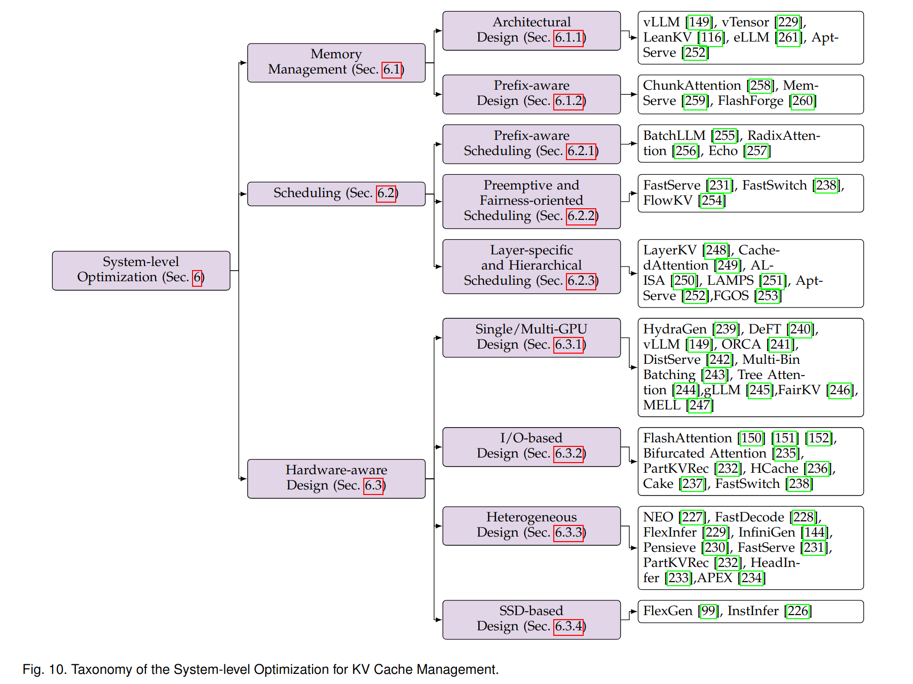 - Prefix-aware scheduling strategies, such as BatchLLM and RadixAttention. For example, unlike traditional LRU caches, BatchLLM identifies global prefixes and coordinates the scheduling of requests sharing common KV cache content. This ensures optimal KV cache reuse while minimizing cache lifetime: requests with identical prefixes are deliberately scheduled together to maximize KV cache sharing efficiency.