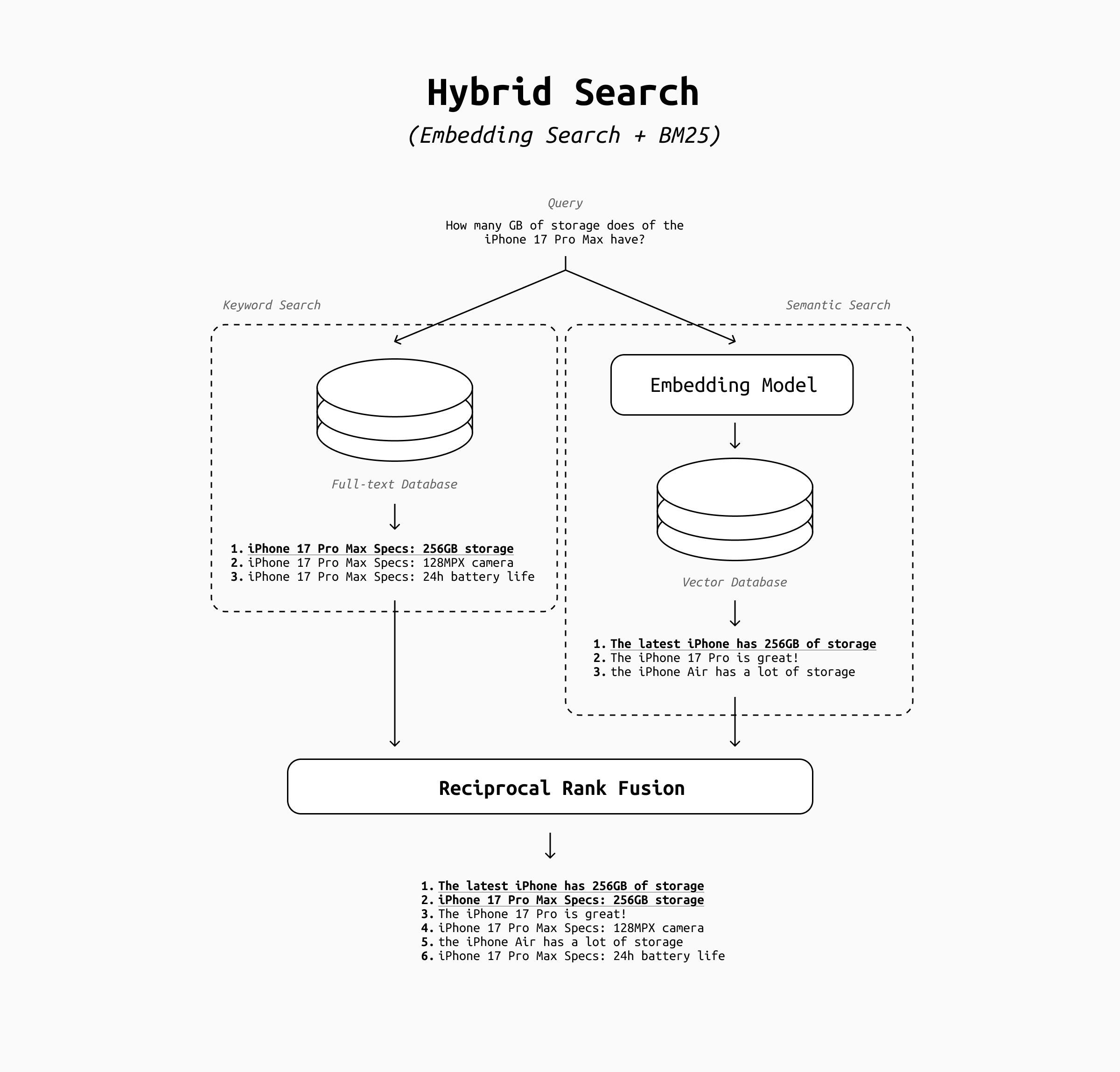 A hybrid search system is simply a system that does the same search twice: once with a keyword algorithm such as BM25, and once with vector search. But how to merge the two lists of results?