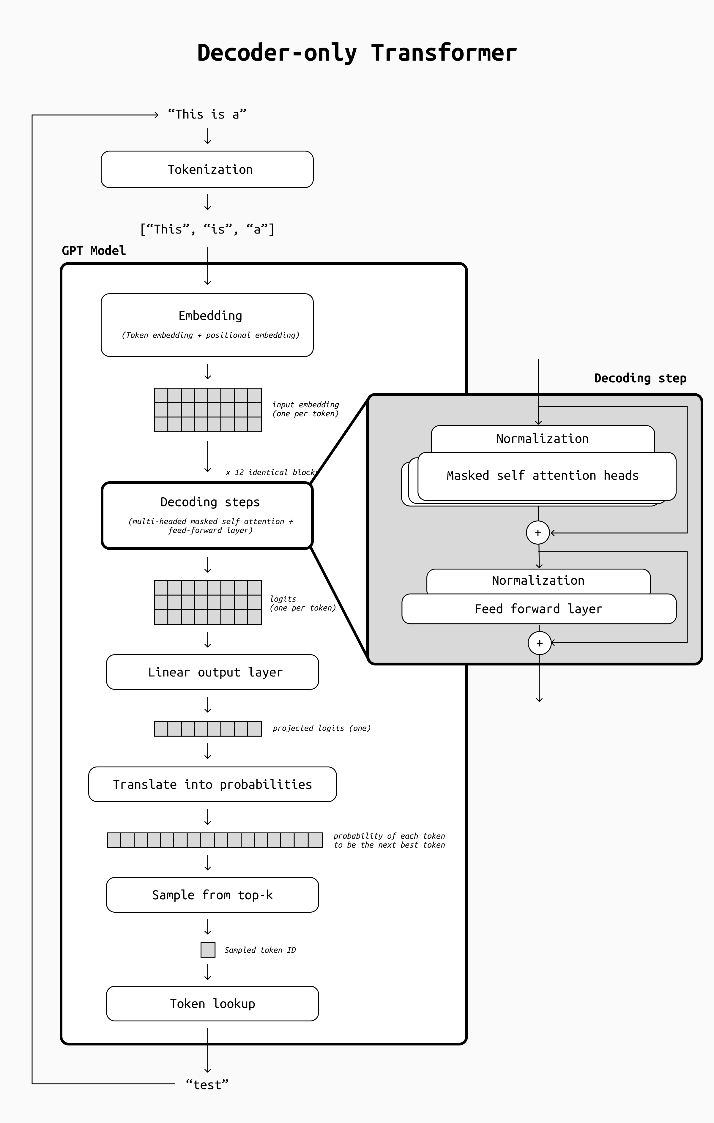 In order to understand MoE, you should first be familiar with the basic architecture of decoder-only Transformers. If the diagram below is not familiar to you, have a look at this detailed description before diving in.