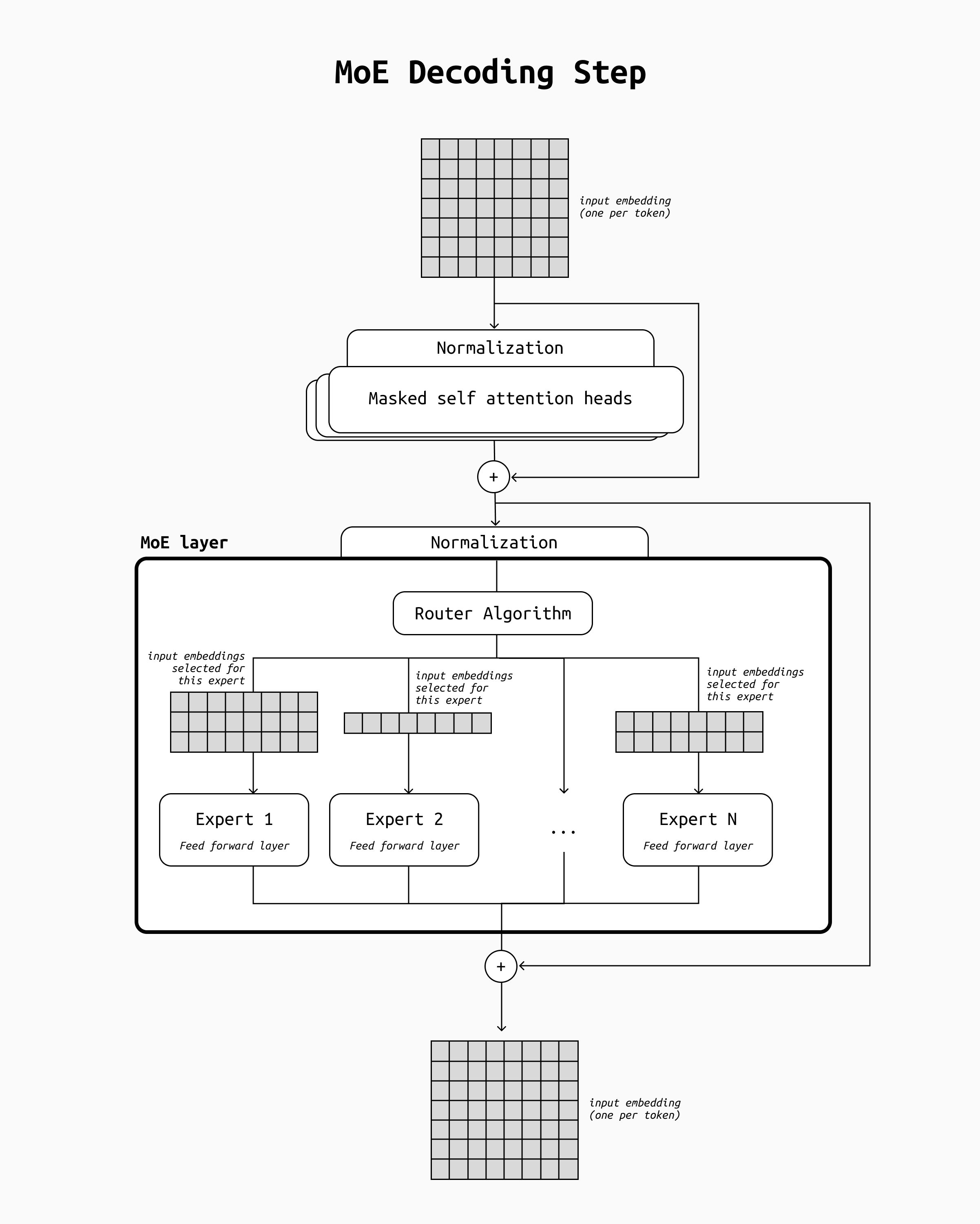 Keep in mind that this is a simplification of the actual routing mechanism of real MoE models. If implemented as described here, through the training phase you would observe a routing collapse: the routing network would learn to send all tokens to the same expert all the time, reducing your MoE model back to the equivalent of a regular decoder-only Transformer. To make the network learn to distribute the tokens in a more balanced fashion, you would need to add auxiliary loss functions that make the routing network learn to load balance the experts properly. For more details on this process (and much more on MoE in general) see this detailed overview.