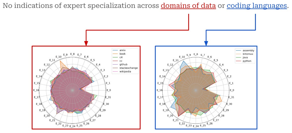 According to the authors, this specialization is due to the same tokens being sent to the same expert every time, regardless of the context in which it is used. Given that different languages use a very different set of tokens, it's natural to see this sort of specialization emerging, and the same can be said of specific tasks, where the jargon and the word frequency changes strongly. The paper defines this behavior as “Context-Independent Specialization”.