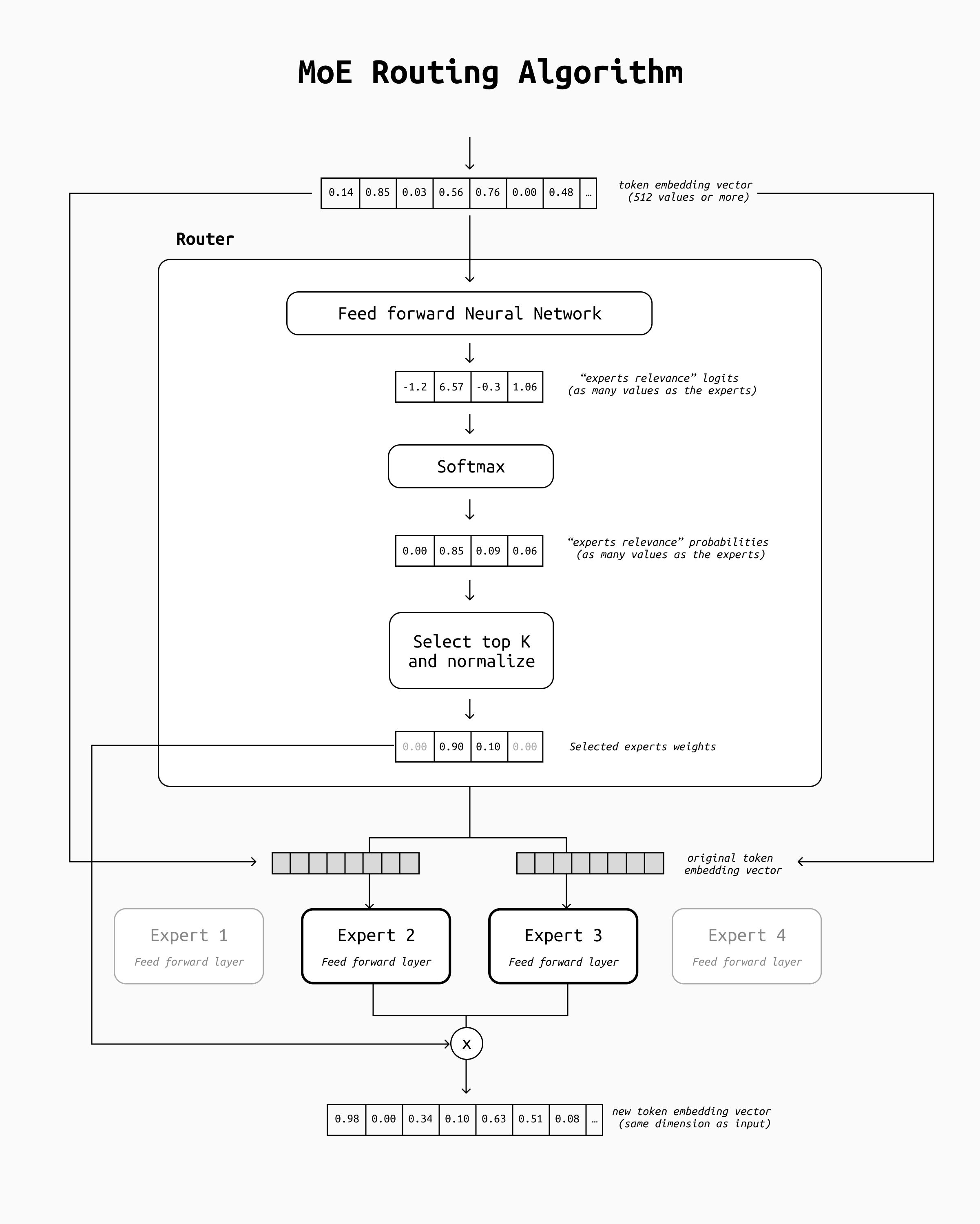 The core of a routing algorithm is rather simple as well. First the token's embedding passes through a linear transformation (such as a fully connected layer) that outputs a vector as long as the number of experts we have in our system. Then, a softmax is applied and the top-k experts are selected. After the experts produce output, their results are then averaged (using their initial score as weight) and sent to the next decode layer.