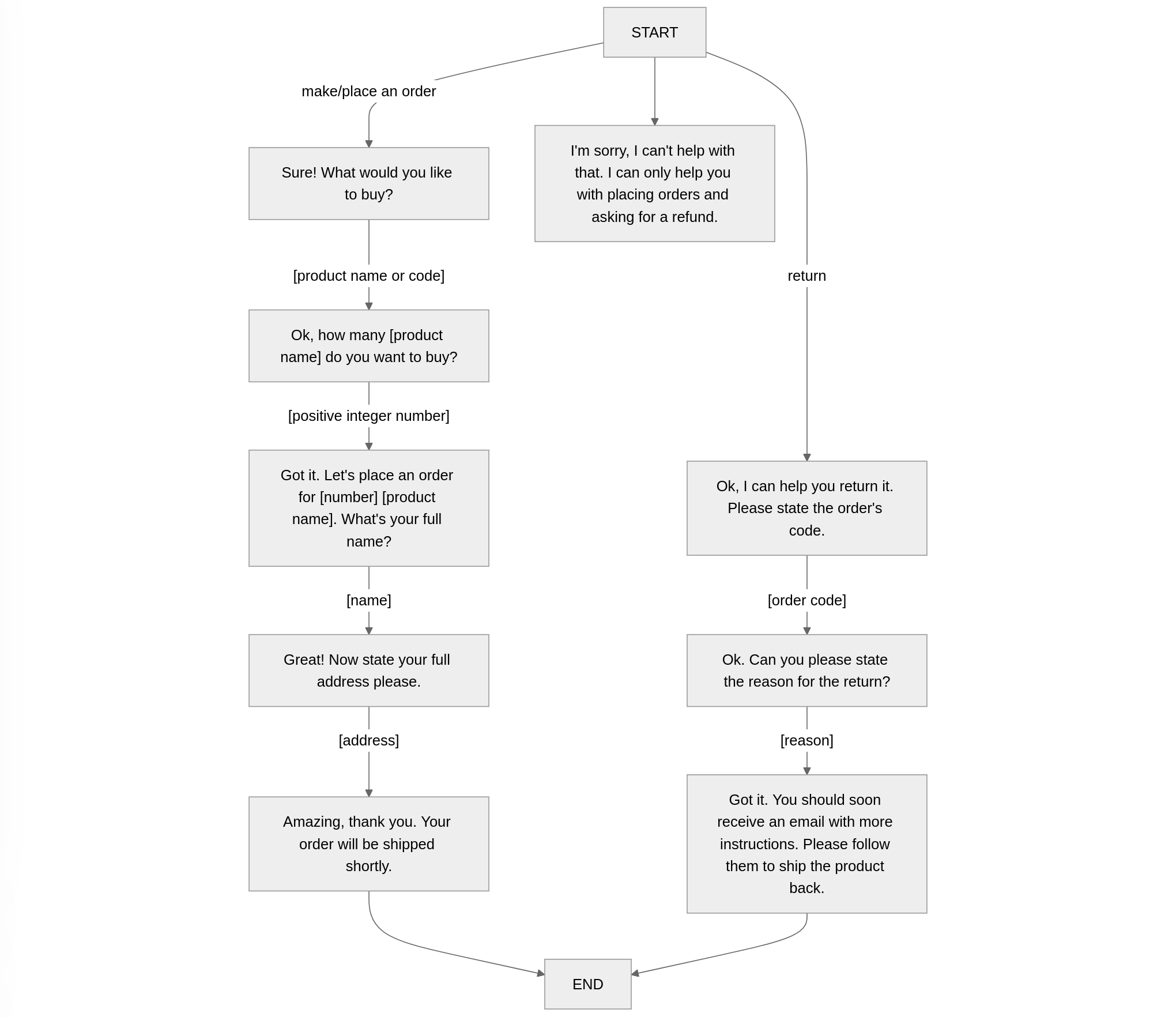 Example of a very simple decision tree for a chatbot. While rather minimal, this bot already has several flaws: there's no way to correct the information you entered at a previous step, and it has no ability to recognize synonyms ("I want to buy an item" would trigger the fallback route.)