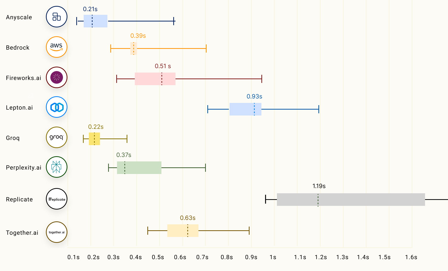 Time to First Token (TTFT) stats for several LLM inference providers running Llama 2 70B chat. From LLMPerf leaderboard. You can see how the time it takes for a reply to even start being produced is highly variable, going up to more than one second in some scenarios.
