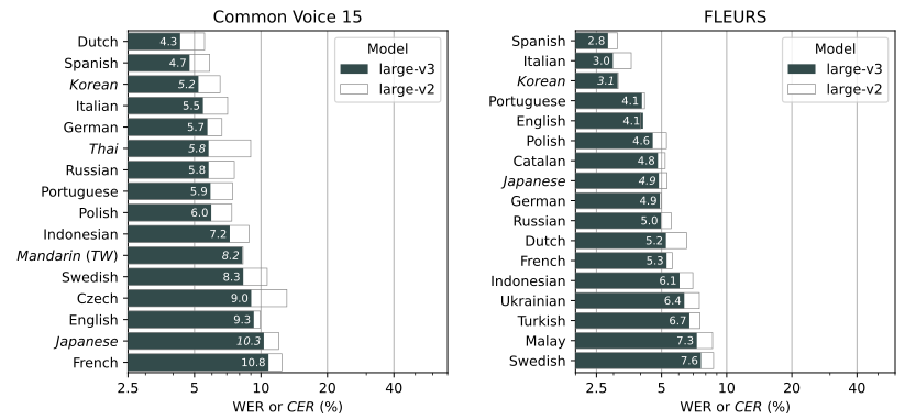 The WER (word error rate) of Whisper was extremely impressive at the time of its publication (see the full diagram here).