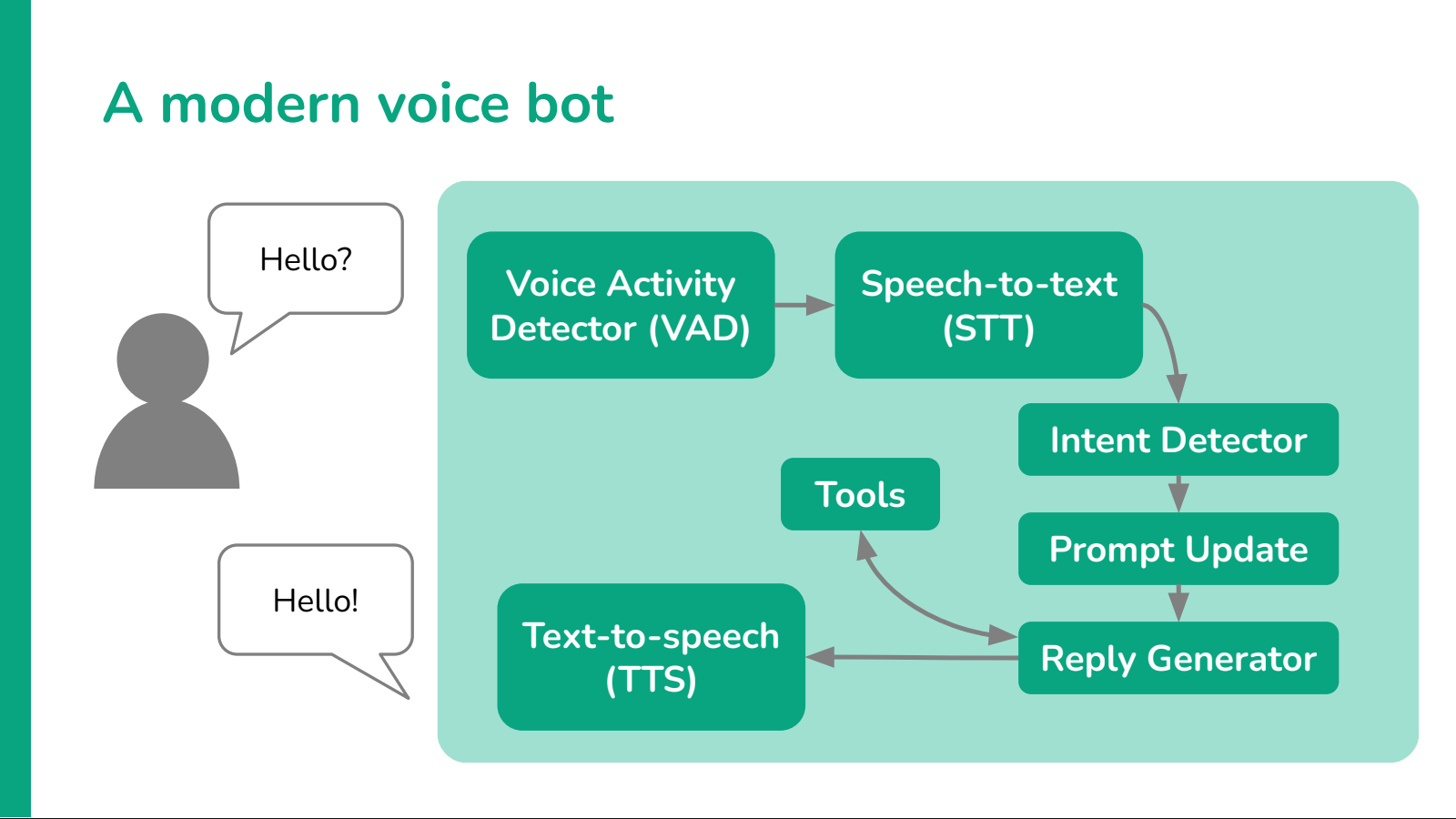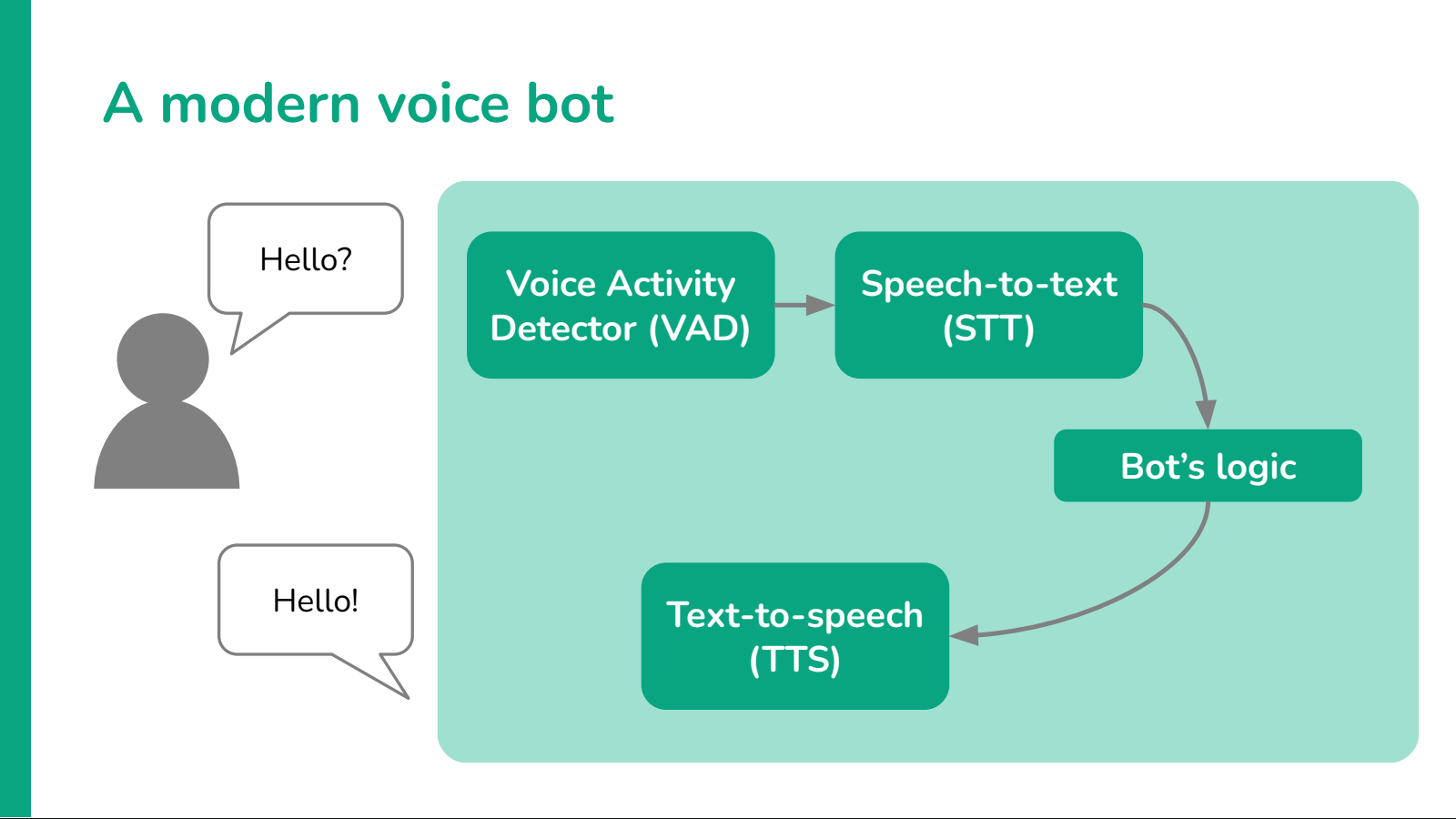 One of the simplest improvements to this architecture is the addition of a robust Voice Activity Detection (VAD) model. VAD gives the bot the ability to hear interruptions from the user and react to them accordingly, helping to break the classic, rigid turn-based interactions of old-style bots.