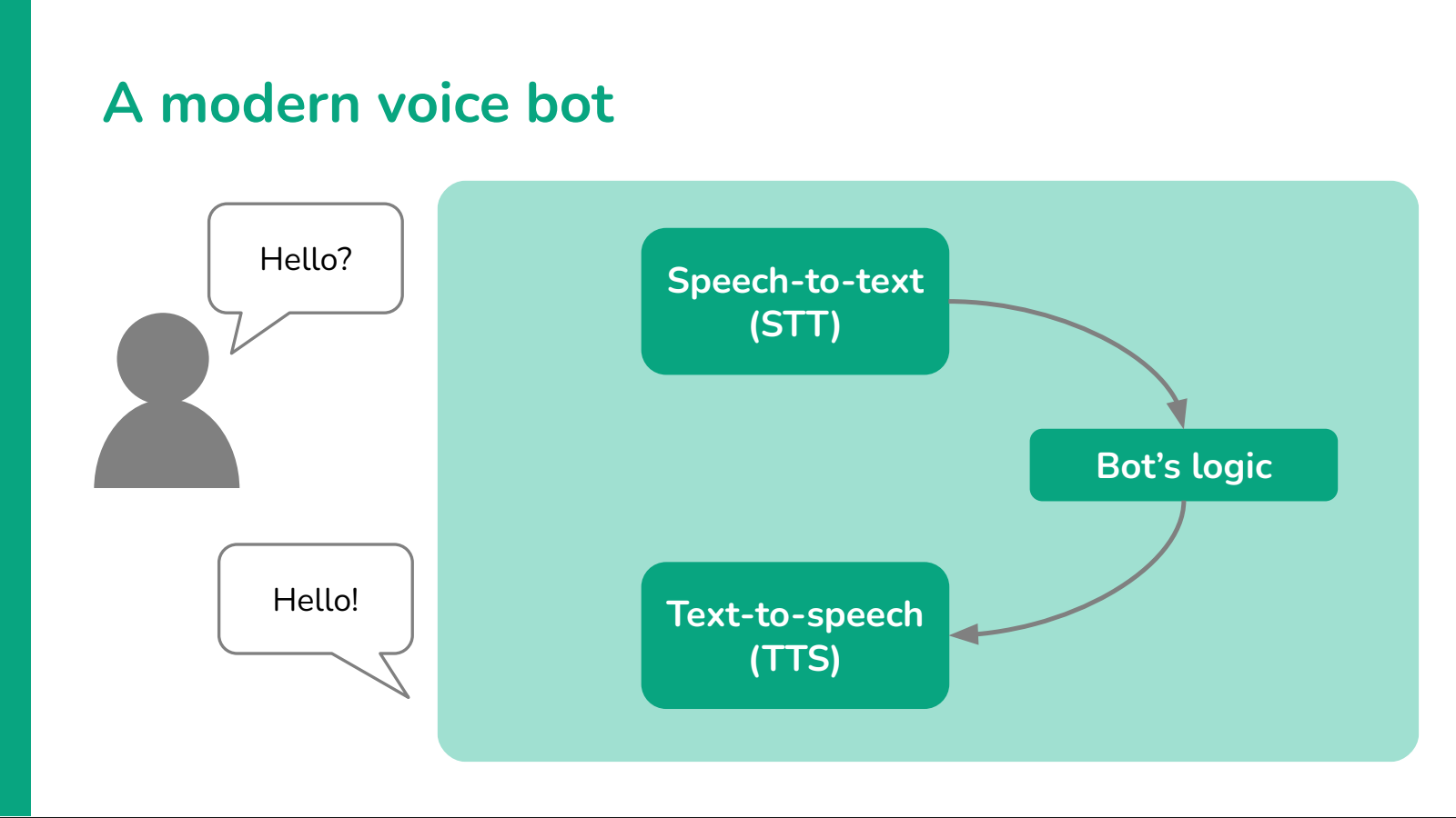 In Part 1 we've seen mostly the challenges related to building such bot: we discussed the basic structure of most voice bots today, their shortcomings and the main issues that you may face on your journey to improve the quality of the conversation.